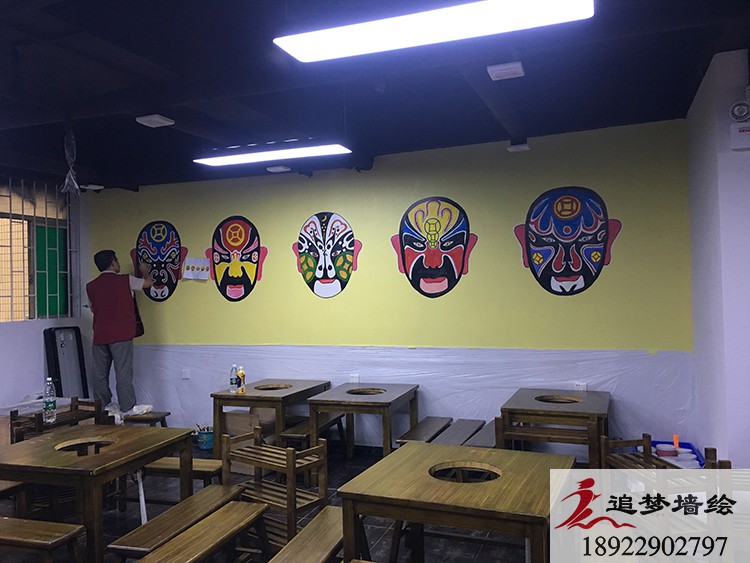 墙绘项目介绍:根据客户的要求,我们结合了传统戏剧花旦人物和五财神脸谱,长墙上也做了一些火辣的辣椒图案,让店铺看起来更加的红红火火,风味十足。