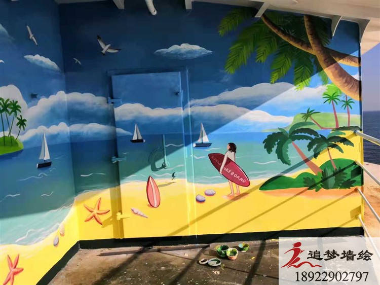 轮船彩绘。在广西北海,一艘船发来“支援的信号”,他们想要让他们船成为海上“最靓的仔”,想在船的正面的四五层绘画一些东西。于是就和我们追梦墙绘展开了合作,经过一天交流后,我们确认了主题,就打算画一些有种沙滩度假的感觉的画面。由于风格和画面不是说明的很详细,我们修修改改了好几次,客户也一直跟进的添加一些东西,最后终于确认好了,我们画师就马上到北海去上船绘画。在海上的风景很漂亮,黄昏时的夕阳更是美得不像话。经过四五天的奋斗,这些蓝天白云、海鸥、椰树海岛、沙滩休闲等等的画面就一一呈现出来了。这次的方案虽然有些曲折,但还是完美的搞定了。