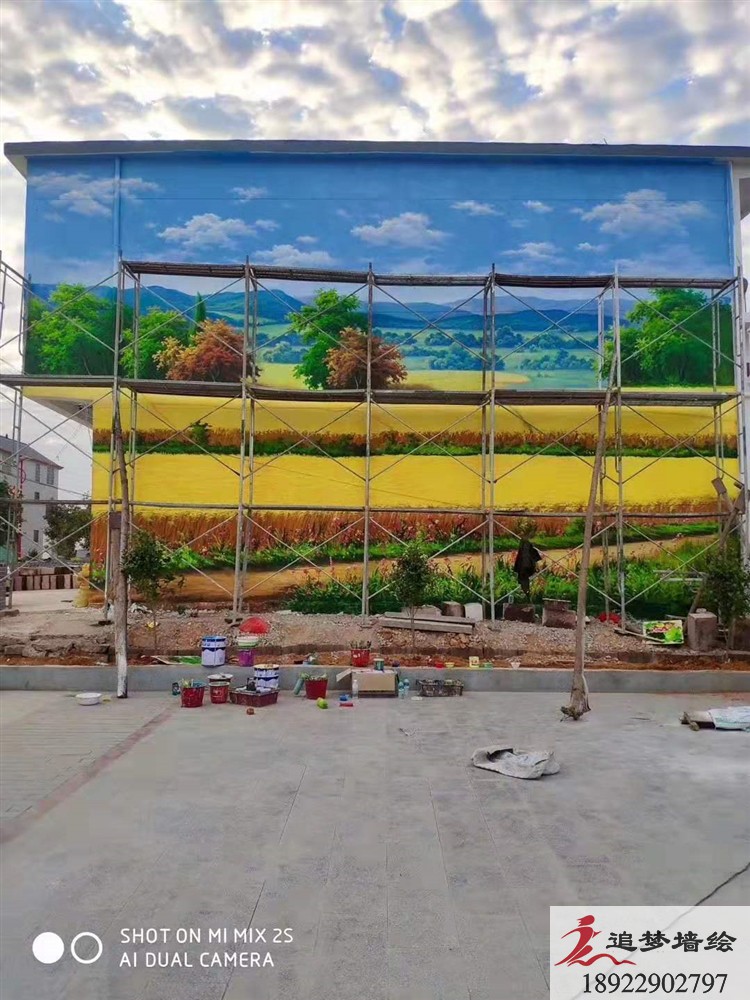 韶关市新丰县文化墙。关于乡村文化墙的绘画,我们画师绘画的非常多了,这次绘画虽然有点多,但对他们来说都是小菜一碟。在乡村绘画的时候最关键的一点是天气,这几天的天气很好,不下雨又不是很晒,有不少的白云,这样的天气很适合在户外绘画。就四五天的时间就差不多画完了,乡村的文化墙绘画很多时候都相似的,像农民耕田插秧、青山绿水、本地的建筑房子、党建文化、乡村振兴这些都是乡村文化墙绘画主要内容。这些内容的墙绘我们非常熟悉有经验的,如有需要请找我们追梦墙绘。